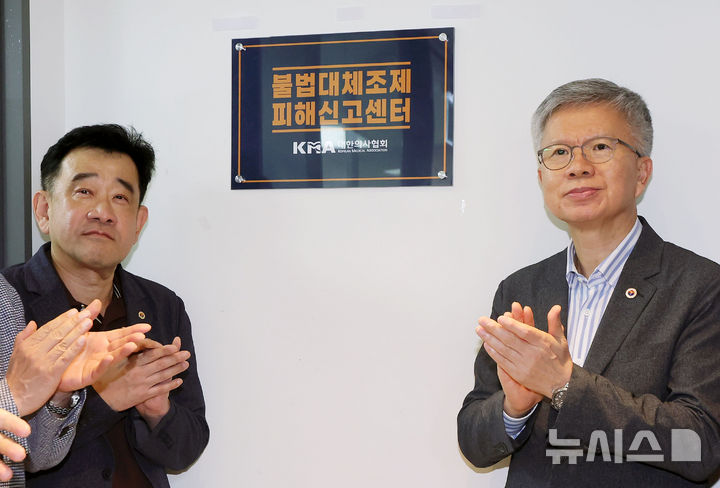 [서울=뉴시스] 홍효식 기자 = 3일 오후 서울 용산구 대한의사협회에서 열린 대한의사협회 '불법 대체조제 피해 신고센터' 개소식에서 김택우(오른쪽) 대한의사협회 회장과 이주병 센터장이 현판 제막 후 박수를 치고 있다. 2025.09.03. [email protected]