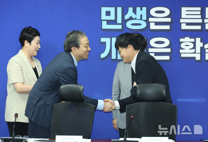 [서울=뉴시스] 고승민 기자 = 박주민 국회 보건복지위원장과 문진영 대통령실 사회수석이 4일 서울 여의도 국회 의원회관에서 열린 보건복지 당·정·대 협의에서 인사를 하고 있다. 2025.09.04. [email protected]