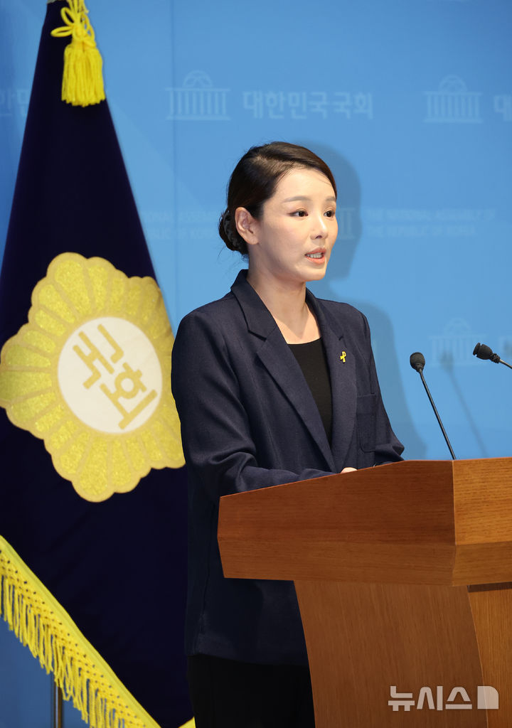 [서울=뉴시스] 김금보 기자 = 강미정 조국혁신당 대변인이 4일 서울 여의도 국회 소통관에서 당내 성비위 의혹과 관련한 탈당 기자회견을 하고 있다. 2025.09.04. [email protected]