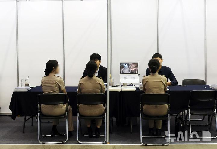 [부산=뉴시스] 하경민 기자 = '2025년 해양수산 취업박람회'가 열린 4일 부산 해운대구 벡스코 제2전시장에서 구직자들이 구인업체 부스를 찾아 현장 채용 상담 및 면접을 하고 있다.