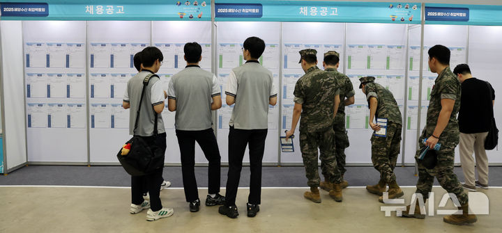 [부산=뉴시스] 하경민 기자 = '2025년 해양수산 취업박람회'가 열린 4일 부산 해운대구 벡스코 제2전시장에서 해군 장병과 고교생 등이 채용공고 게시판을 살펴보고 있다.