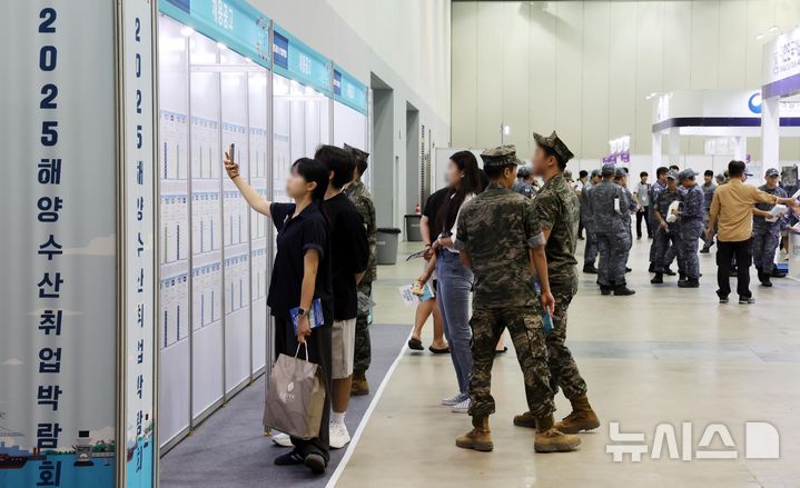 [부산=뉴시스] 하경민 기자 = '2025년 해양수산 취업박람회'가 열린 4일 부산 해운대구 벡스코 제2전시장에서 해군 장병 등이 채용공고 게시판을 살펴보고 있다.