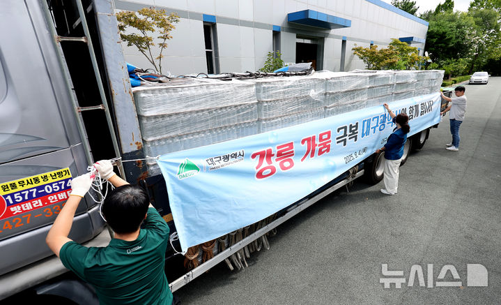 [대구=뉴시스] 이무열 기자 = 4일 대구 수성구 노변동 대구시상수도사업본부 고산정수사업소에서 대구시 자연재난과 직원들이 최근 극심한 가뭄으로 어려움을 겪고 있는 강릉 지역 시민들을 위한 생수 지원차량에 ‘강릉 가뭄 극복’ 현수막을 부착하고 있다. 2025.09.04. [email protected]