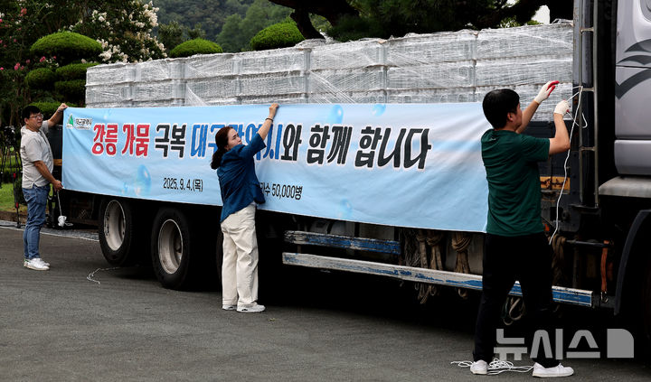 [대구=뉴시스] 이무열 기자 = 4일 대구 수성구 노변동 대구시상수도사업본부 고산정수사업소에서 대구시 자연재난과 직원들이 최근 극심한 가뭄으로 어려움을 겪고 있는 강릉 지역 시민들을 위한 생수 지원차량에 ‘강릉 가뭄 극복’ 현수막을 부착하고 있다. 2025.09.04. [email protected]