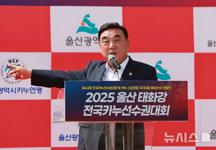 [울산=뉴시스] 배병수 기자 = 김두겸 울산시장이 4일 남구 태화강변 번영교 인근에서 열린 2025 울산 태화강 전국카누선수권대회 개회식에서 인사말을 하고 있다. [email protected].