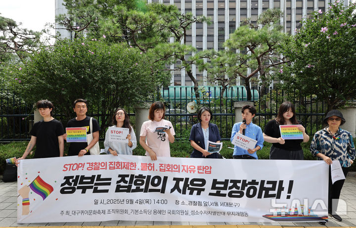 [서울=뉴시스] 배훈식 기자 = 대구퀴어문화축제 조직위원회와 용혜인 기본소득당 의원, 성소수자차별반대 무지개행동 참여자들이 4일 오후 서울 서대문구 경찰청 앞에서 기자회견을 열고 집회의 자유 보장을 촉구하고 있다. 2025.09.04. [email protected]