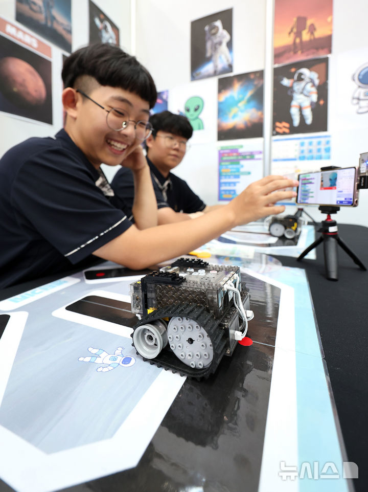 [대구=뉴시스] 이무열 기자 = 4일 대구 달서구 대구학생문화센터 실내체육관에서 열린 ‘2025 교육기부 진로체험 인증기관 박람회’를 찾은 중학생들이 AI 인공지능 부스에서 로봇 탐사 체험을 하고 있다. 2025.09.04. [email protected]