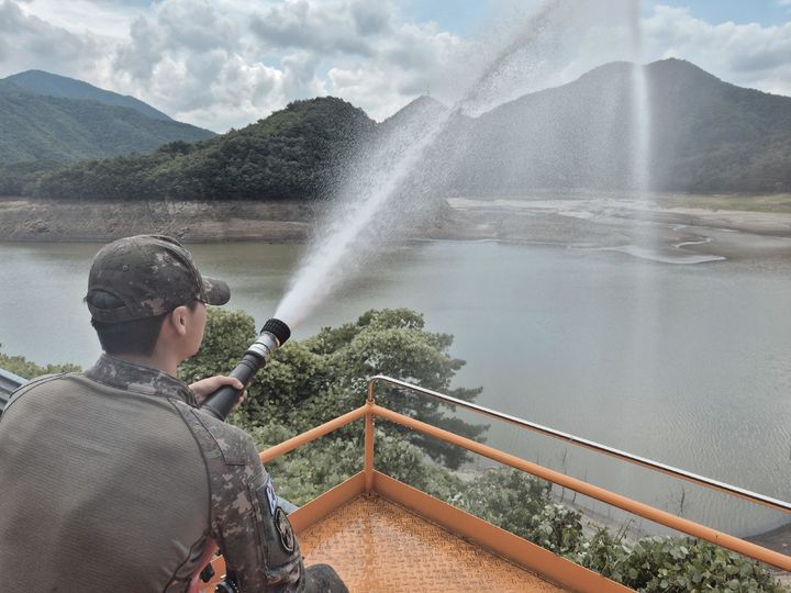 [서울=뉴시스] 육군은 가뭄 장기화로 재난지역으로 선포된 강원 강릉지역에 지난 2일부터 4일까지 급수차량 300여 대, 장병 600여 명을 지원해 급수난 해소를 위해 노력하고 있다고 밝혔다. 사진은 지난 3일 육군 3군단 장병들이 급수차를 이용해 오봉저수지에 물을 채우고 있는 모습. (사진=육군 제공) 2025.09.04. [email protected] *재판매 및 DB 금지