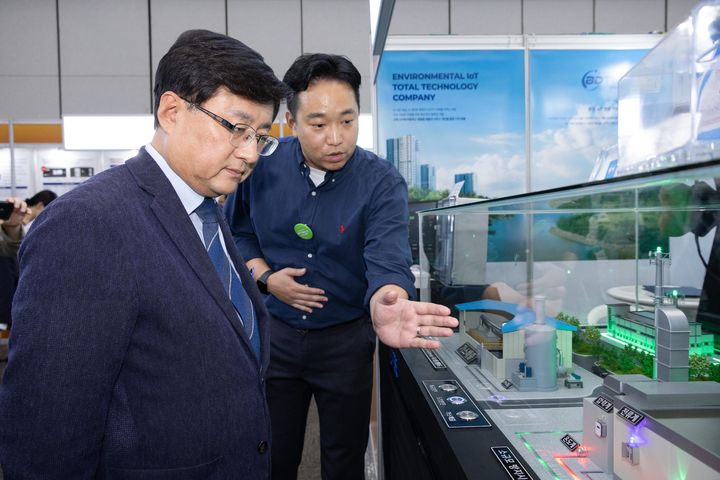 [서울=뉴시스] 김성환 환경부 장관이 4일 경기도 고양시 일산 킨텍스에서 열린 제6회 푸른 하늘의 날 정부 기념식에 참석해 전시 부스를 관람하고 있다. (사진=환경부 제공) 2025.09.04. [email protected] *재판매 및 DB 금지