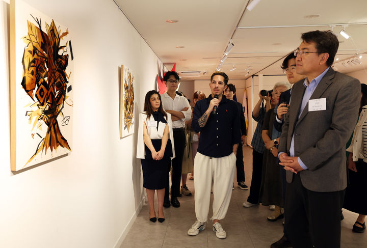 [서울=뉴시스] 오승록 노원구청장이 4일 서울 노원구 경춘선숲길 갤러리에서 열린 한국·엘살바도르 수교 63주년 기념 'Flower's Memory' 전시 개막식에 참석해 작가의 작품 설명을 듣고 있다.