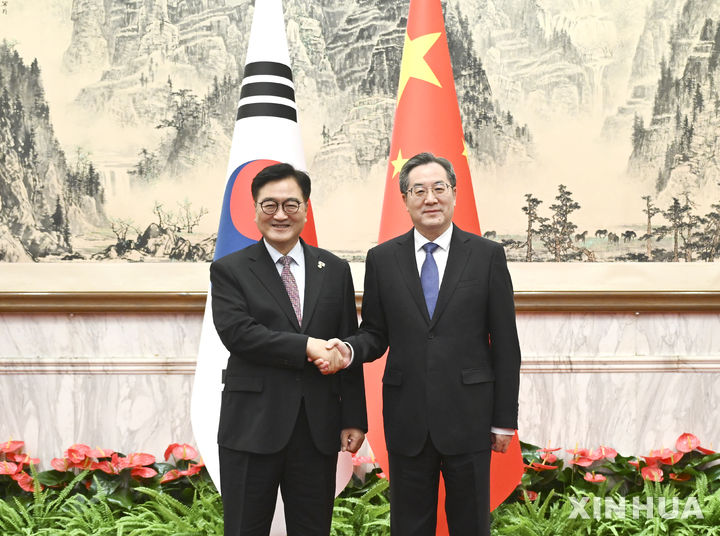 [베이징=신화/뉴시스] 우원식(왼쪽) 국회의장이 4일(현지 시간) 중국 베이징 댜오위타이 영빈관에서 딩쉐샹 중국 국무원 부총리와 면담 전 악수하고 있다. 우원식 의장은 지난 3일 베이징 톈안먼 광장에서 열린 '중국 인민 항일 전쟁 및 세계 반파시스트 전쟁 승리(전승절)' 80주년 열병식 참석을 위해 중국을 방문했다. 2025.09.05.