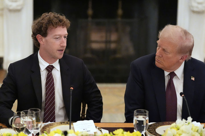 [워싱턴=AP/뉴시스] 마크 저커버그(왼쪽) 메타 최고경영자(CEO)가 4일(현지 시간) 백악관 국빈 만찬장에서 열린 만찬에 참석해 도널드 트럼프 대통령과 얘기하고 있다. 2025.09.05.