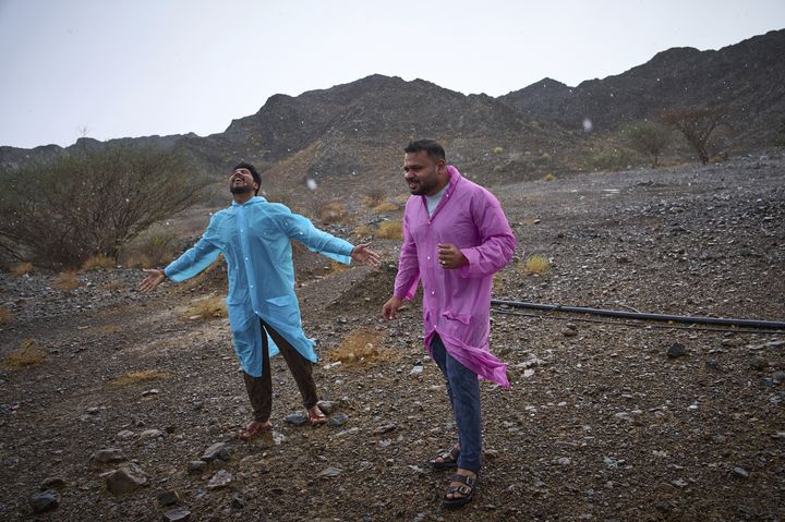 [푸자이라=AP/뉴시스] 지난달 30일(현지 시간) 아랍에미리트(UAE) 푸자이라에서 우비를 입은 주민들이 모처림 내리는 비를 맞고 있다. UAE는 1년 내내 거의 비가 내리지 않아 비가 내리는 것이 즐거운 경험이 되기도 한다. 2025.09.05.