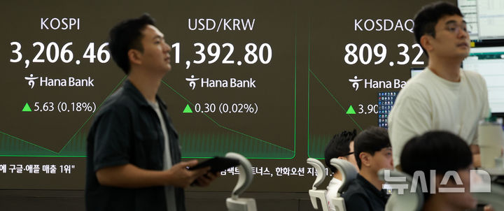 [서울=뉴시스] 이영환 기자 = 코스피가 전 거래일(3200.83)보다 8.00포인트(0.25%) 오른 3208.83에 개장한 5일 오전 서울 중구 하나은행 딜링룸 전광판에 지수가 표시되고 있다.