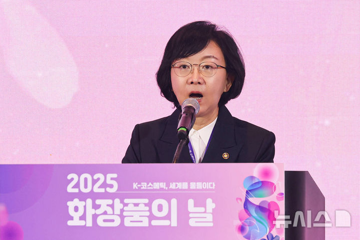 [서울=뉴시스] 권창회 기자 = 오유경 식약처장이 5일 서울 강서구 코엑스 마곡에서 열린 2025 화장품의 날 기념식에서 인사말을 하고 있다. 2025.09.05. [email protected]