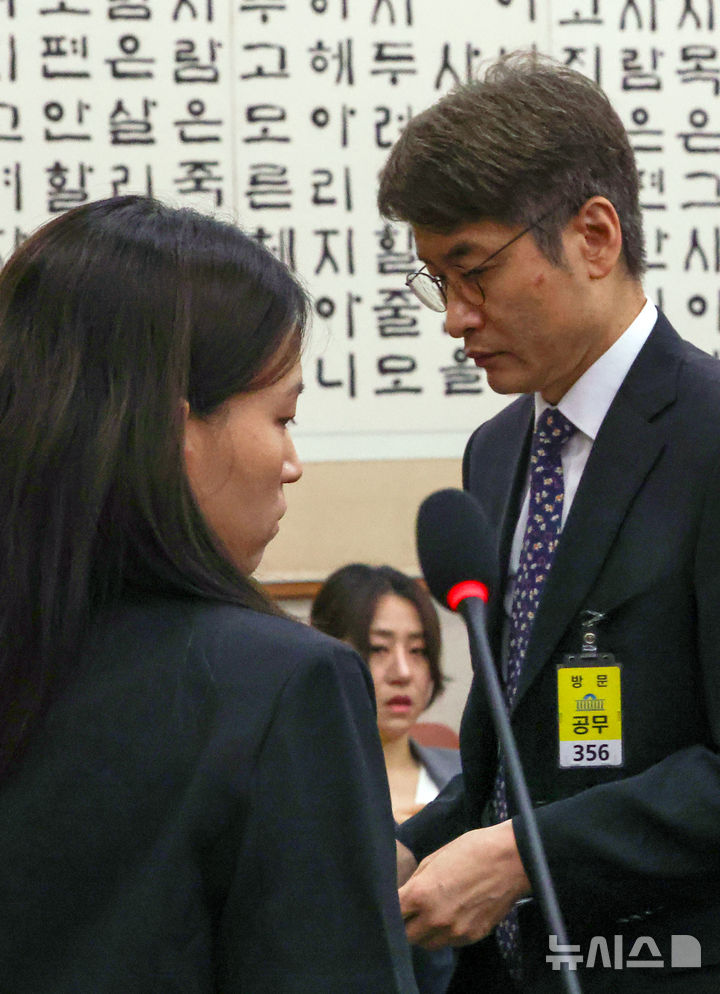[서울=뉴시스] 김명년 기자 = 5일 서울 여의도 국회에서 열린 법제사법위원회 검찰개혁 입법청문회에서 증인으로 출석한 박건욱 대구지방검찰청 인권보호관(전 서울남부지검 부장검사)가 건진법사 진성배씨 자택 압수수색에서 발견된 현금 관봉권 띠지 분실 관련 질의에 답하기 위해 발언대로 향하고 있다. 왼쪽은 김정민 남부지검 수사관. 2025.09.05. [email protected]