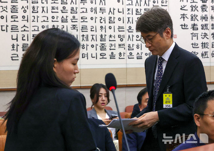 [서울=뉴시스] 김명년 기자 = 5일 서울 여의도 국회에서 열린 법제사법위원회 검찰개혁 입법청문회에서 증인으로 출석한 박건욱 대구지방검찰청 인권보호관(전 서울남부지검 부장검사)가 건진법사 진성배씨 자택 압수수색에서 발견된 현금 관봉권 띠지 분실 관련 질의에 답하기 위해 발언대로 향하고 있다. 왼쪽은 김정민 남부지검 수사관. 2025.09.05. [email protected]
