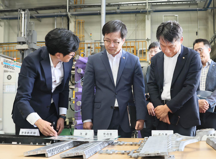 [서울=뉴시스] 여한구(가운데) 산업통상자원부 통상교섭본부장이 5일 경북 구미국가산단 내 최첨단 디스플레이 IT부품과 친환경 수소차와 전기자동차 2차전지 부품을 공급하는 세아메카닉스를 방문해 설명을 듣고 있다. (사진=산업통상자원부 제공) 2025.09.05. [email protected] *재판매 및 DB 금지
