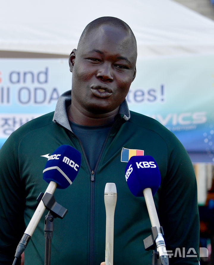 [광주=뉴시스] 류형근 기자 = 파리올림픽 '1점궁사' 아프리카 차드의 이스라엘 마다예가 5일 오후 광주 서구 광주월드컵경기장에서 '광주2025현대세계양궁선수권대회' 출전을 앞두고 각오를 밝히고 있다. 2025.09.05. [email protected]