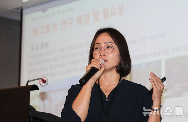 [제주=뉴시스] 우장호 기자 = 이보라 국립산림과학원 난대·아열대산림연구소 연구사가 5일 오후 제주시 연동 제주썬호텔 대회의장에서 열린 '2025 제2회 나무포럼' 포켓세션에서 '마을 주민과 함께 하는 제주도 세미 맹그로브숲'을 주제로 발표하고 있다.