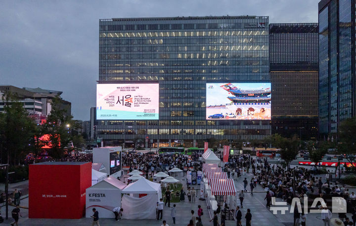 [서울=뉴시스] 김선웅 기자 = 5일 서울 종로구 KT 광화문빌딩 웨스트 사옥에 설치된 초대형 미디어월 'KT 스퀘어'에서 영상이 송출되고 있다. 2025.09.05. [email protected]