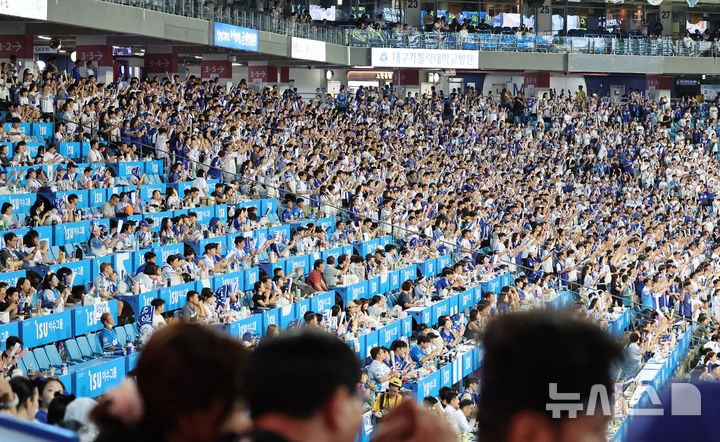 [대구=뉴시스] 이무열 기자 = 5일 대구 수성구 삼성라이온즈파크에서 열린 2025 신한 SOL 뱅크 KBO 리그 키움 히어로즈와 삼성 라이온즈의 경기에서 관중들이 열띤 응원을 하고 있다.