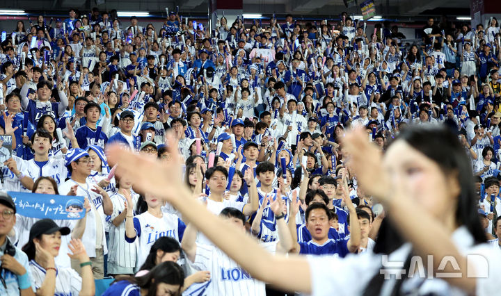 [대구=뉴시스] 이무열 기자 = 5일 대구 수성구 삼성라이온즈파크에서 열린 2025 신한 SOL 뱅크 KBO 리그 키움 히어로즈와 삼성 라이온즈의 경기에서 관중들이 열띤 응원을 하고 있다.