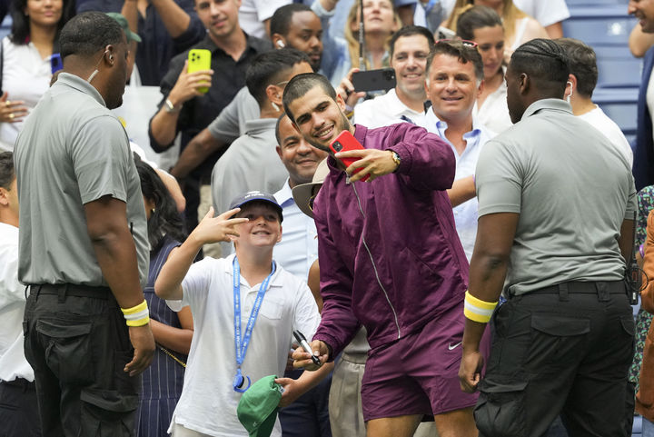 [뉴욕=AP/뉴시스] 카를로스 알카라스(2위·스페인)가 5일(현지 시간) 미국 뉴욕의 빌리진킹 내셔널 테니스 센터에서 열린 US 오픈 남자 단식 4강전에서 노바크 조코비치(7위·세르비아)를 물리친 후 한 소년 팬과 셀카를 찍고 있다. 알카라스가 3-0(6-4 7-6 6-2)으로 승리하고 결승에 선착했다. 2025.09.06.