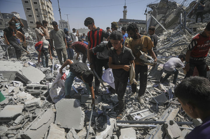 [가자시티=AP/뉴시스] 5일(현지 시간) 가자지구 가자시티에서 팔레스타인 주민들이 이스라엘군(IDF)의 공습으로 파괴된 건물 잔해에서 쓸만한 물건을 찾아 수거하고 있다. IDF는 가자시티의 한 고층 건물을 표적 공습했으며 민간인 피해를 최소화하기 위해 대피령을 내린 후 정밀 무기로 타격했다고 밝혔다. 2025.09.06.