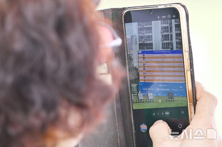 [광주=뉴시스] 이영주 기자 = 광주2025현대세계양궁선수권대회 컴파운드 남녀 개인 예선이 치러지는 6일 오전 광주 남구 광주국제양궁장에서 한 시민이 대한민국 국가대표 선수들이 이름이 출력된 전광판을 사진찍고 있다. 2025.09.06. [email protected]