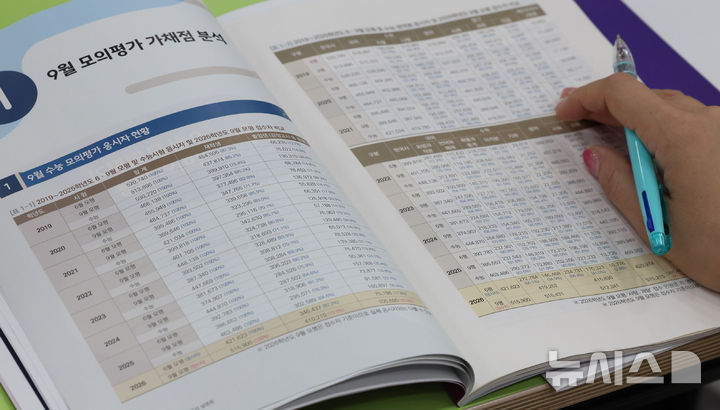 [서울=뉴시스] 권창회 기자 = 6일 서울 강남구 강남하이퍼학원 본원에서 열린 '9월 모의평가 분석설명회에서 학부모들이 9월 모평 분석집을 살펴보고 있다. 2025.09.06. [email protected]