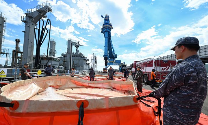 [서울=뉴시스] 권창회 기자 = 6일 강원 강릉시 안인항 화력발전소 하역부두에서 군수지원함 대청함 승조원을 비롯한 해군 장병들이 이동식 저수조에 청수를 공급하고 있다. 해군은 강릉지역 가뭄 해소를 위해 군수지원함 대청함(AOE-Ⅰ, 4200톤급)을 투입해 긴급 급수지원에 나섰다. 이날 대청함은 소방차 약 70여 대 분량, 약 450,000리터의 청수를 지원했다. (사진=해군 제공) 2025.09.06. [email protected] *재판매 및 DB 금지