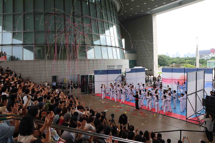 [서울=뉴시스] 권창회 기자 = 국기원 태권도 시범단이 6일 오후 서울 용산구 국립중앙박물관 열린마당에서 열린 공연예술축제 박물관문화향연에서 멋진 무대를 펼치고 있다. (사진=국기원 제공) 2025.09.06. [email protected] *재판매 및 DB 금지