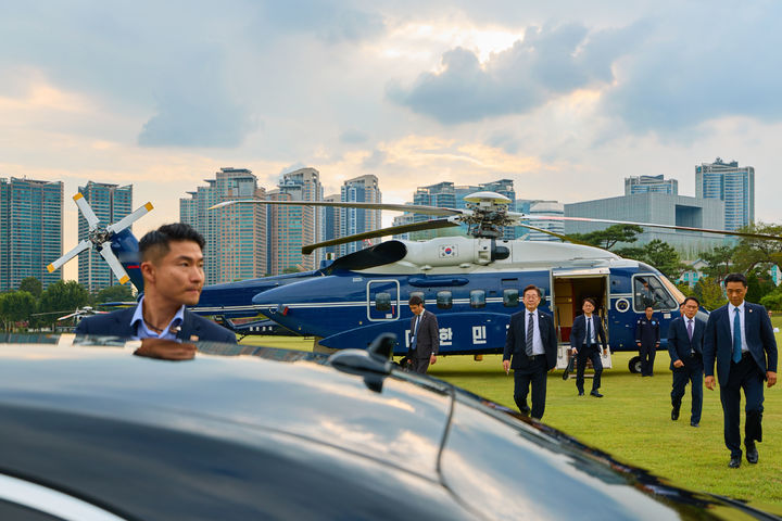[서울=뉴시스] 최동준 기자 = 대통령실은 이재명 대통령이 서울 용산에서 헬기 하차 후 이동하는 모습을 6일 SNS에 공개했다. (사진=이재명 대통령 SNS) 2025.09.06. [email protected] *재판매 및 DB 금지