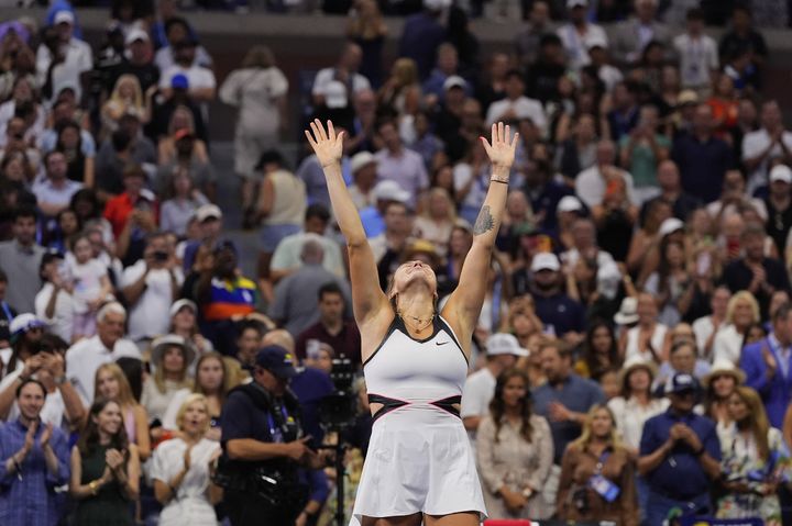 [뉴욕=AP/뉴시스] 아리나 사발렌카(1위·벨라루스)가 6일(현지 시간) 미국 뉴욕의 빌리진킹 내셔널 테니스 센터에서 열린 US 오픈 여자 단식 결승에서 어맨다 아니시모바(9위·미국)를 2-0(6-3 7-6)으로 물리치고 대회 2연패를 달성하며 환호하고 있다. 2025.09.07.