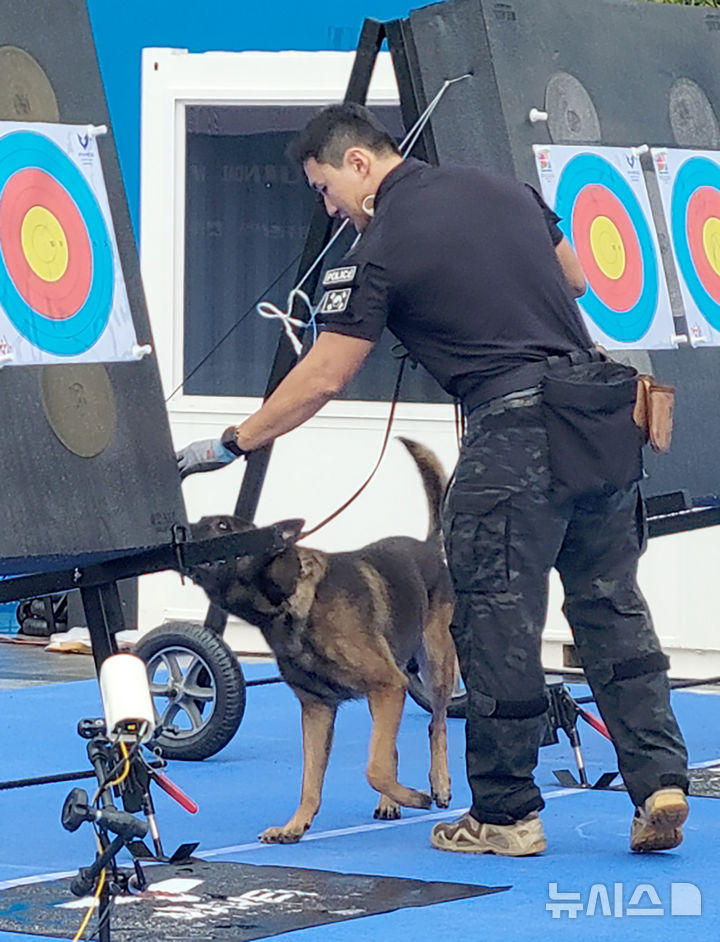 [광주=뉴시스] 류형근 기자 = 광주2025현대세계양궁선수권대회 개막 사흘째인 7일 오전 광주 동구 5·18민주광장에 설치된 결선 경기장에서 광주경찰청 경찰특공대 폭발물탐지견이 폭발물을 탐지하고 있다. (사진=독자제공). 2025.09.07. [email protected]