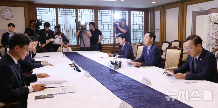 [서울=뉴시스] 김명원 기자 = 구윤철 경제부총리 겸 기획재정부 장관, 윤창렬 국무조정실장, 김윤덕 국토교통부 장관, 권대영 금융위 부위원장, 임광현 국세청장이 7일 오전 서울 종로구 정부서울청사에서 열린 부동산관계장관회의를 하고 있다. 2025.09.07. [email protected]