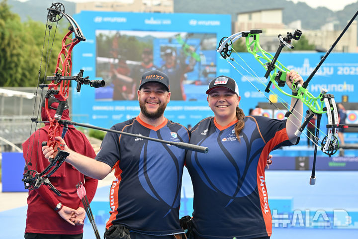 [광주=뉴시스] 이영주 기자 = 7일 오후 광주 동구 5·18민주광장에서 열린 광주2025현대세계양궁선수권대회 컴파운드 혼성 경기 금메달 결정전, 네덜란드 국가대표 마이크 슐로서와 산네 드 라트가 금메달이 결정되자 기뻐하며 웃고 있다. 2025.09.07. [email protected]