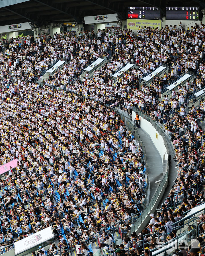 [서울=뉴시스] 최진석 기자 = 7일 서울 잠실야구장에서 열린 ‘2025 KBO리그’ SSG 랜더스와 LG 트윈스의 경기, 야구팬들이 응원을 하고 있다.