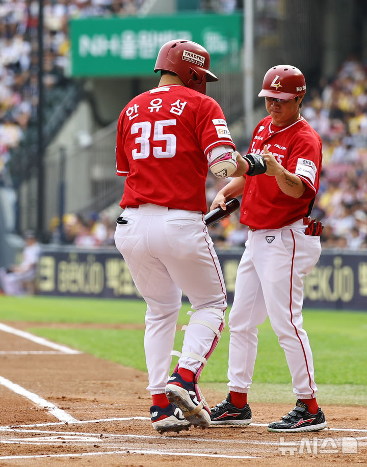 [서울=뉴시스] 최진석 기자 = 7일 서울 잠실야구장에서 열린 ‘2025 KBO리그’ SSG 랜더스와 LG 트윈스의 경기, 1회초 2사 2루 상황 SSG 한유섬이 투런홈런을 치고 득점 후 기뻐하고 있다. 2025.09.07. [email protected]