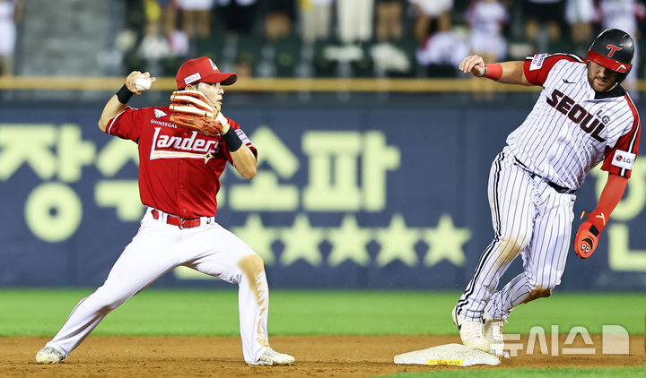 [서울=뉴시스] 최진석 기자 = 7일 서울 잠실야구장에서 열린 ‘2025 KBO리그’ SSG 랜더스와 LG 트윈스의 경기, 8회말 1사 1루 상황 SSG 2루수 정준재가 LG 오스틴을 포스아웃 시킨 뒤 1루를 바라보고 있다. 2025.09.07. [email protected]