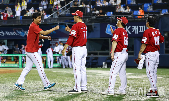 [서울=뉴시스] 최진석 기자 = 7일 서울 잠실야구장에서 열린 ‘2025 KBO리그’ SSG 랜더스와 LG 트윈스의 경기에서 7대3으로 승리한 SSG 이숭용 감독이 김광현과 기뻐하고 있다. 2025.09.07. [email protected]