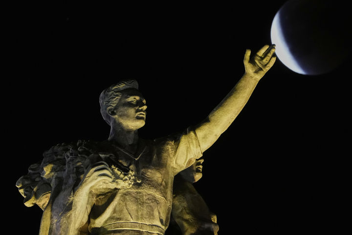[모스크바=AP/뉴시스] 7일(현지 시간) 러시아 모스크바의 국립경제성과전시센터(VDNKh) 중앙 전시관 조형물 위 보름달에서 개기월식이 진행되고 있다. '개기월식'은 달이 지구 그림자에 완전히 가려지는 천문 현상이다. 2025.09.08.