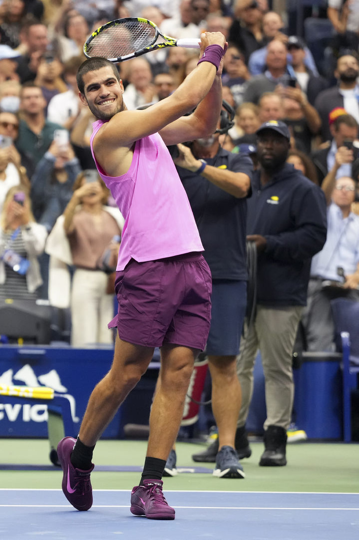 [뉴욕=AP/뉴시스] 카를로스 알카라스(2위·스페인)가 7일(현지 시간) 미국 뉴욕의 빌리진킹 내셔널 테니스 센터에서 열린 US 오픈 남자 단식 결승에서 얀니크 신네르(1위·이탈리아)를 꺾은 후 골프 세리머니를 하고 있다. 알카라스는 2연패를 노리는 신네르를 3-1(6-2 3-6 6-1 6-4)로 꺾고 3년 만에 대회 정상을 탈환했으며 세계 랭킹 1위에도 복귀한다. 2025.09.08.