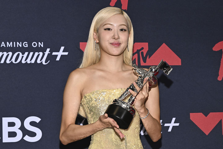 [엘먼트=AP/뉴시스] 블랙핑크의 로제가 7일(현지 시간) 미 뉴욕주 엘먼트의 UBS 아레나에서 열린 '2025 MTV 비디오 뮤직 어워즈'(MTV VMA)에서 아파트(APT.)로 '올해의 노래' 상을 받고 프레스룸에서 포즈를 취하고 있다. 2025.09.08.