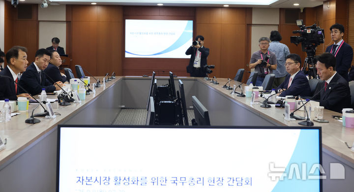 [서울=뉴시스] 김명원 기자 =김민석 국무총리가 8일 오전 서울 영등포구 KRX서울사옥에서 정은보 KRX 이사장, 김학균 신영증권 리서치센터장, 이종형 키움증권 리서치 센터장, 박석길 JP모건 이코노미스트, 김진욱 씨티은행 이코노미스트 등 참석자들과 자본시장 활성화를 위한 현장 간담회를 하고 있다. 2025.09.08. [email protected]