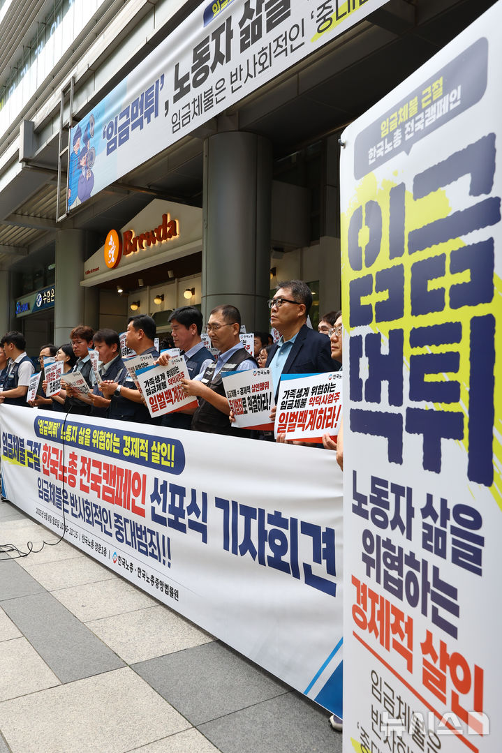 [서울=뉴시스] 황준선 기자 = 한국노동조합총연맹 조합원들이 8일 오전 서울 여의도 한국노총 앞에서 임금체불 근절 한국노총 전국캠페인 선포식 기자회견을 하고 있다. 2025.09.08. [email protected]