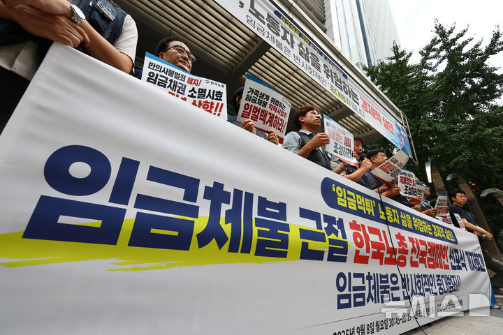 [서울=뉴시스] 황준선 기자 = 한국노동조합총연맹 조합원들이 8일 오전 서울 여의도 한국노총 앞에서 임금체불 근절 한국노총 전국캠페인 선포식 기자회견을 하고 있다. 2025.09.08. [email protected]