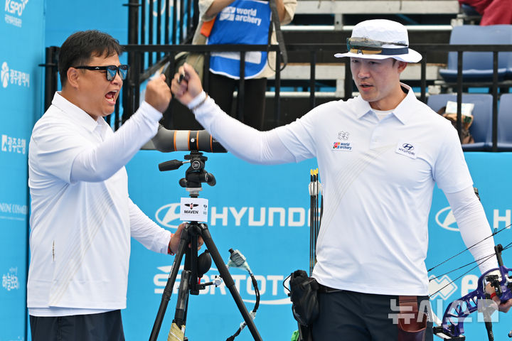 [광주=뉴시스] 이영주 기자 = 8일 오전 광주 동구 5·18민주광장에서 열린 광주2025현대세계양궁선수권대회 컴파운드 남자 개인전 16강, 대한민국 국가대표 최용희(오른쪽)가 코치로부터 격려를 받고 있다. 2025.09.08. [email protected]