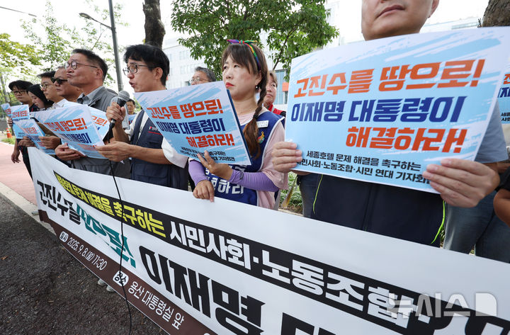 [서울=뉴시스] 김진아 기자 = 8일 서울 용산구 대통령 집무실 앞에서 세종호텔 문제 해결을 촉구하는 시민사회·노동조합·시민연대 기자회견 '고진수를 땅으로!, 이재명 대통령이 해결하라'가 열리고 있다. 2025.09.08. [email protected]